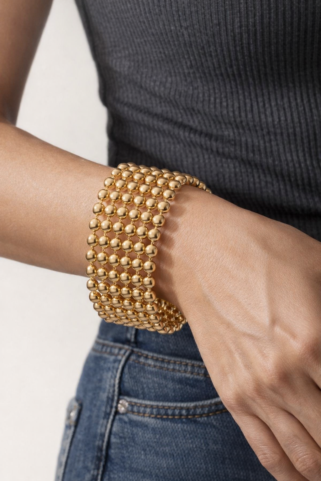 Un bracciale dal design sofisticato e contemporaneo, caratterizzato da una maglia intrecciata di sfere luminose color oro. La struttura avvolgente crea un effetto gioiello deciso ma raffinato, perfetto per valorizzare il polso con stile ed eleganza.