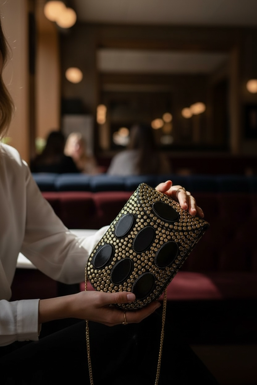 Scintillante come un talismano antico, la Clutch Gioiello Aurum è un’opera d’arte da indossare. Realizzata a mano, è interamente ricoperta da micro-borchie in acciaio dorato e preziosi inserti neri ovali che creano un pattern unico.