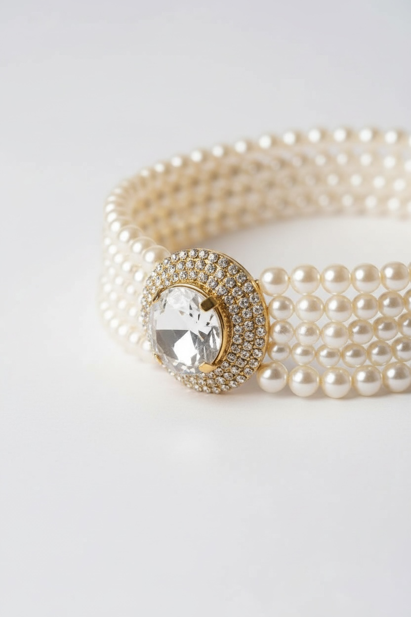 Questo choker è realizzato con file multiple di finte perle bianche, morbide e luminose, che avvolgono delicatamente il collo.