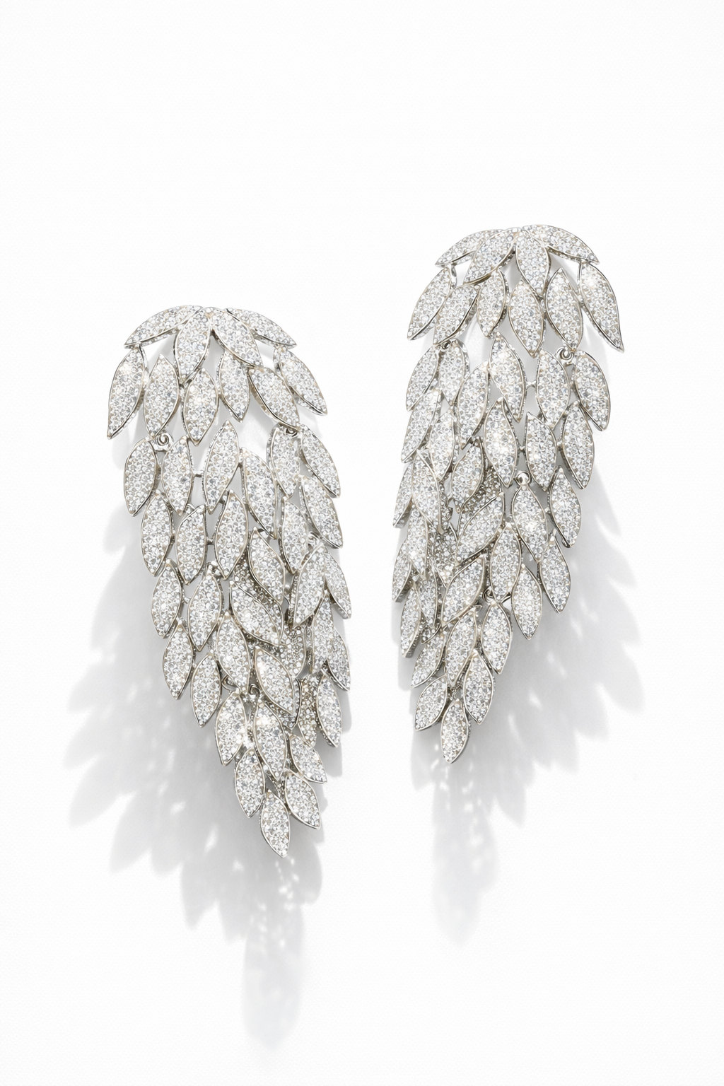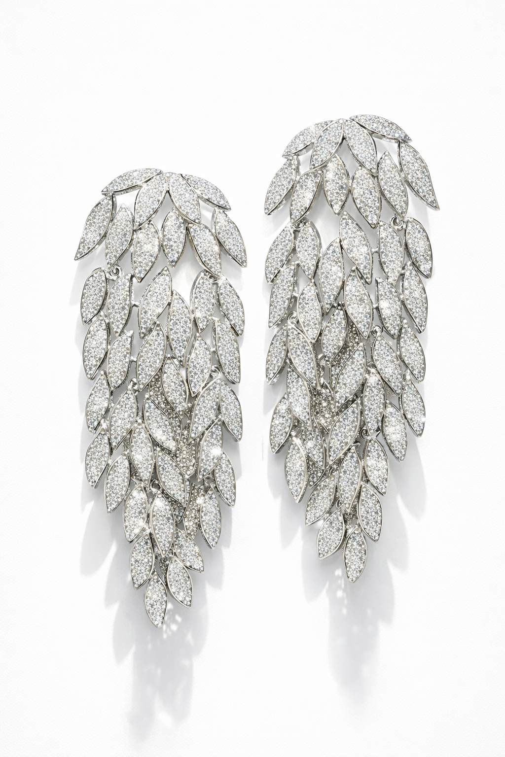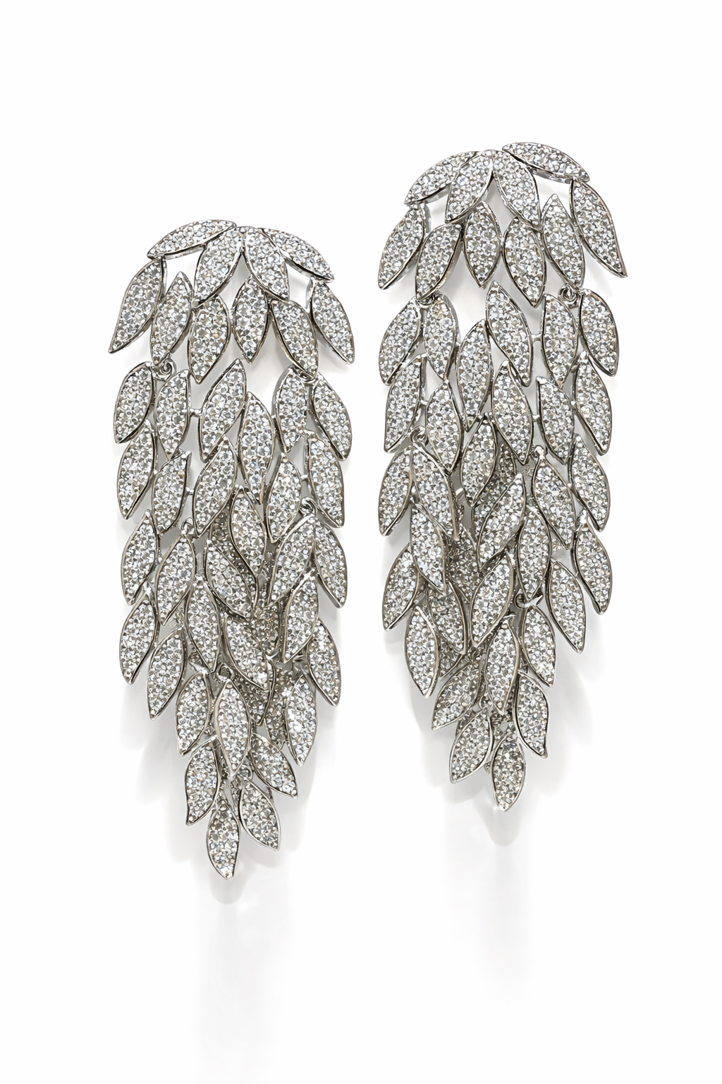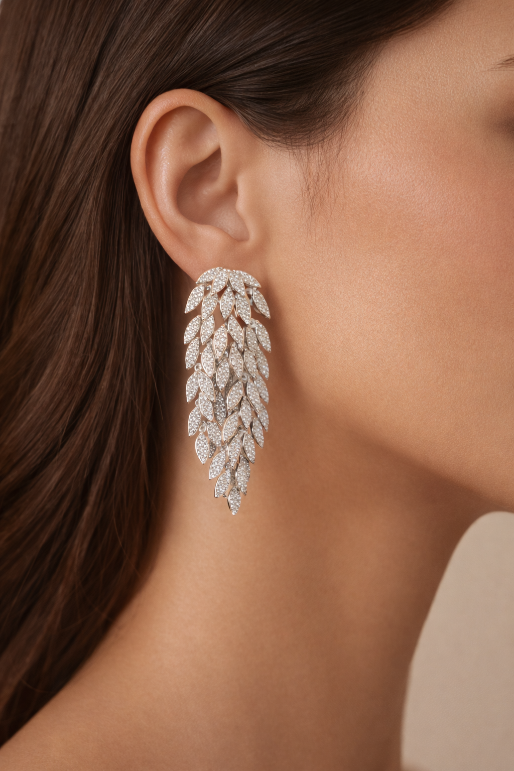 Questi orecchini pendenti sono realizzati in ottone e impreziositi da strass scintillanti, disposti in una raffinata cascata di foglie che cattura la luce ad ogni movimento.