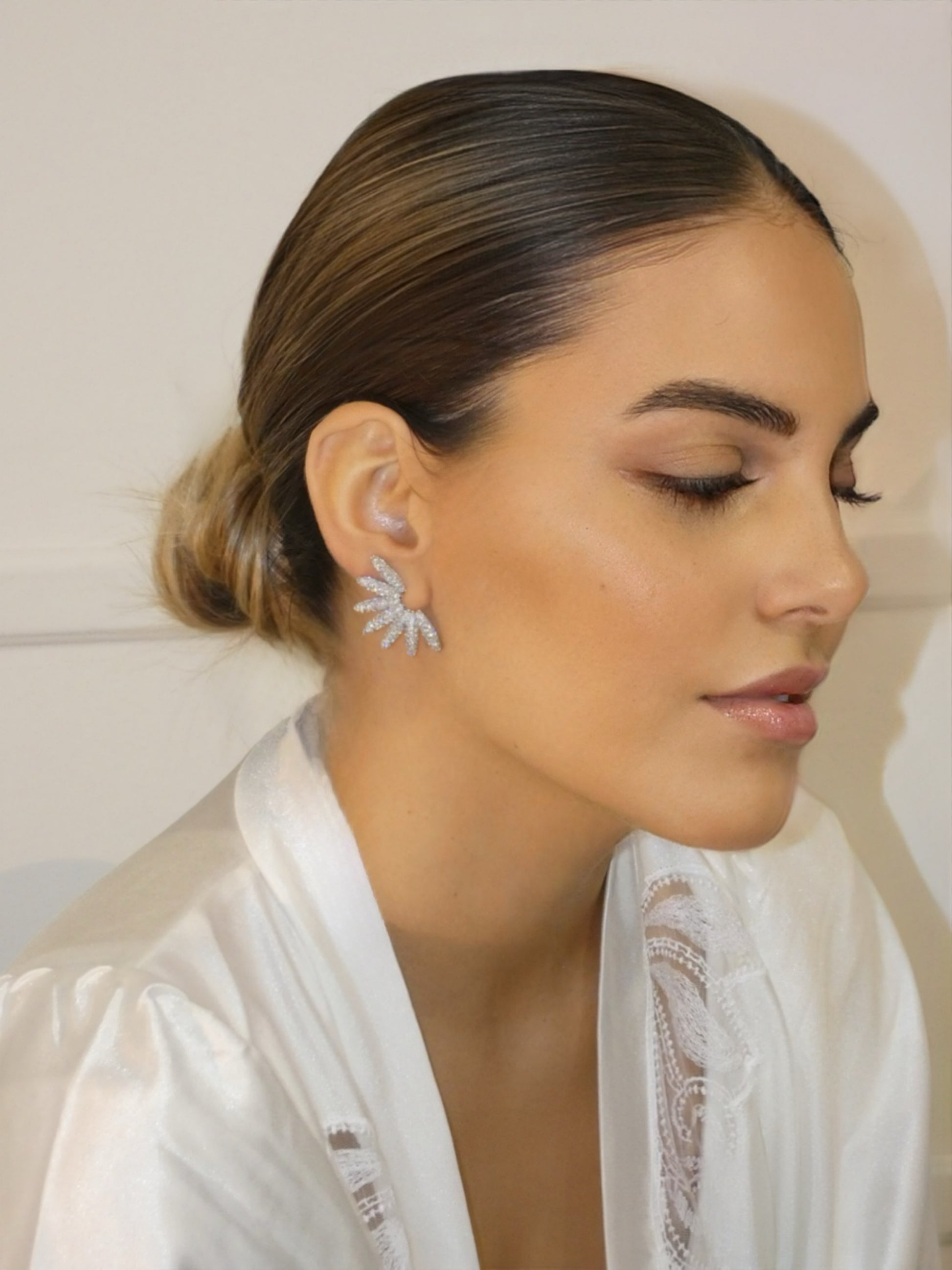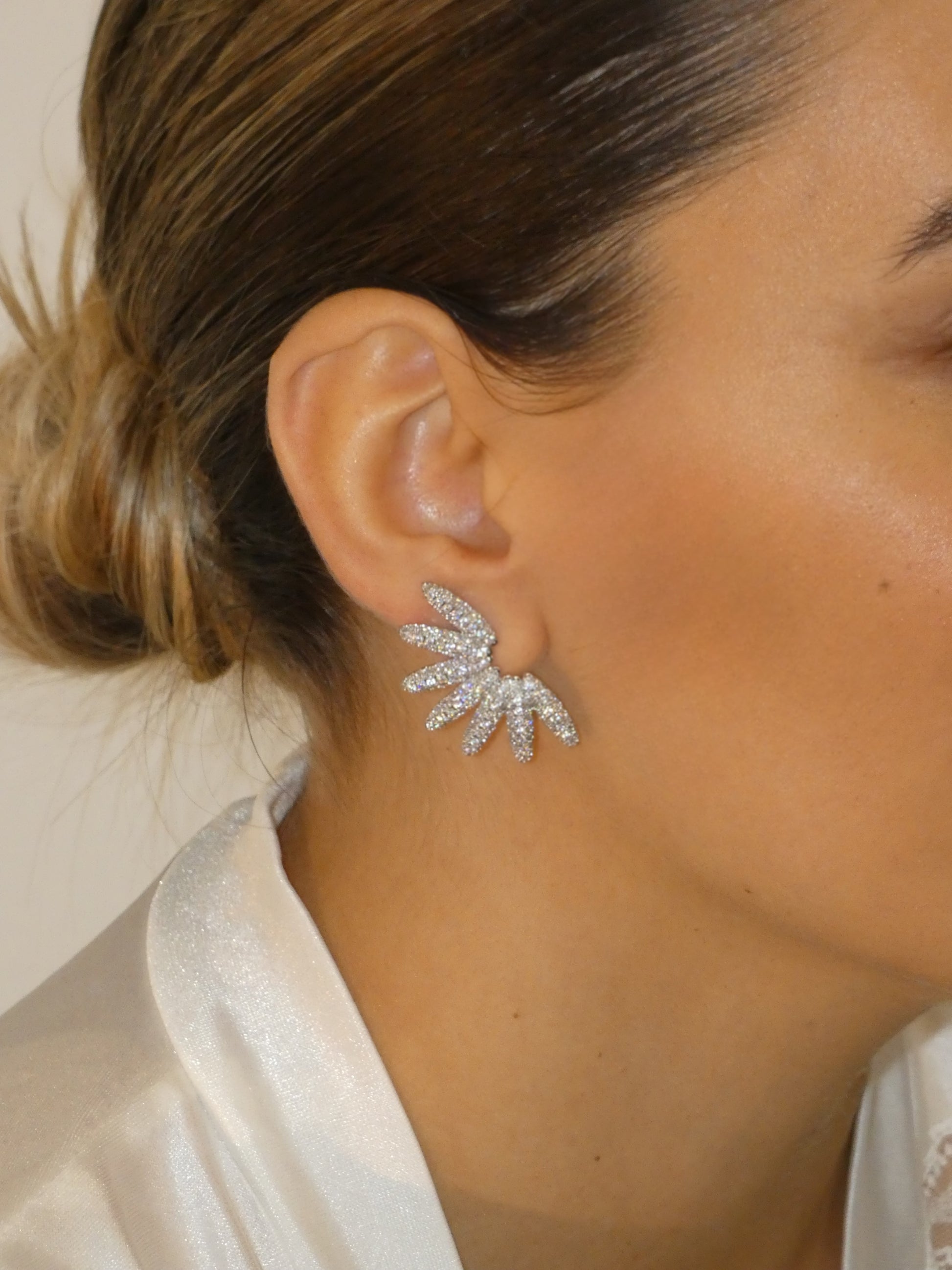 Gli orecchini Elysia sono pensati per la sposa che sogna un dettaglio luminoso, moderno e incredibilmente raffinato. La loro forma a petali aperti incornicia il volto con una brillantezza delicata, aggiungendo un tocco etereo ad ogni look nuziale.