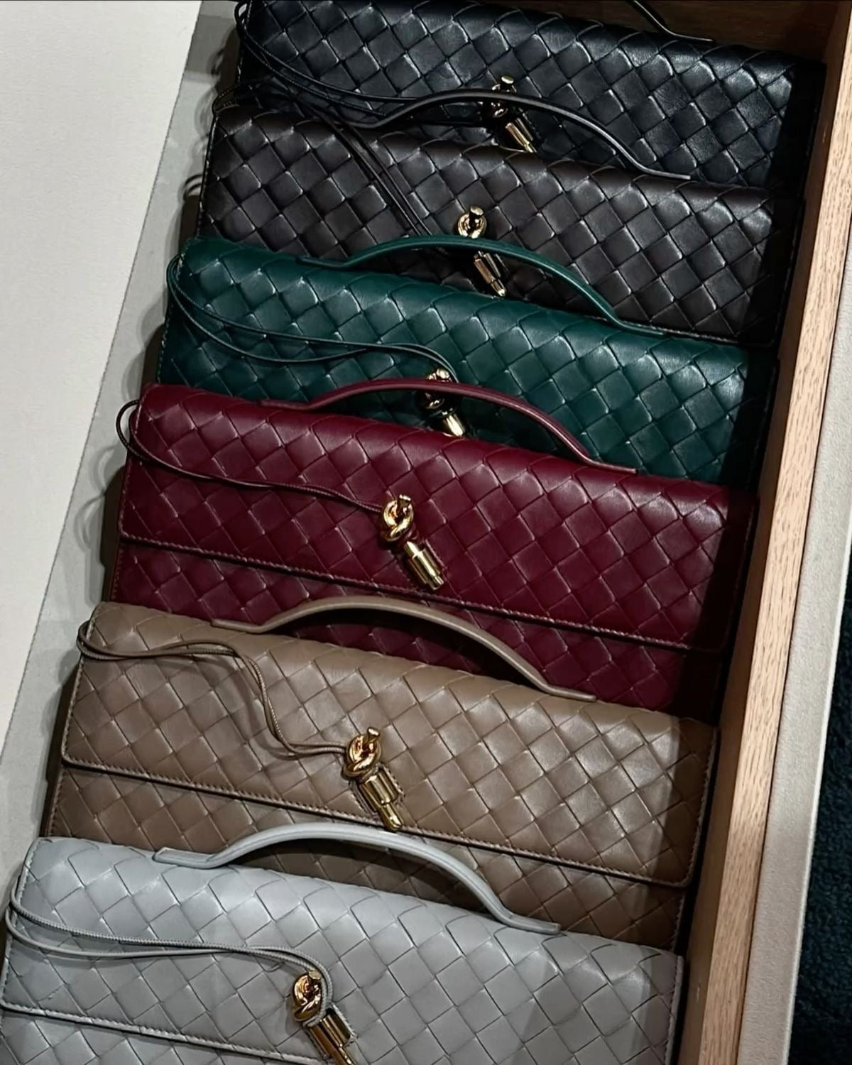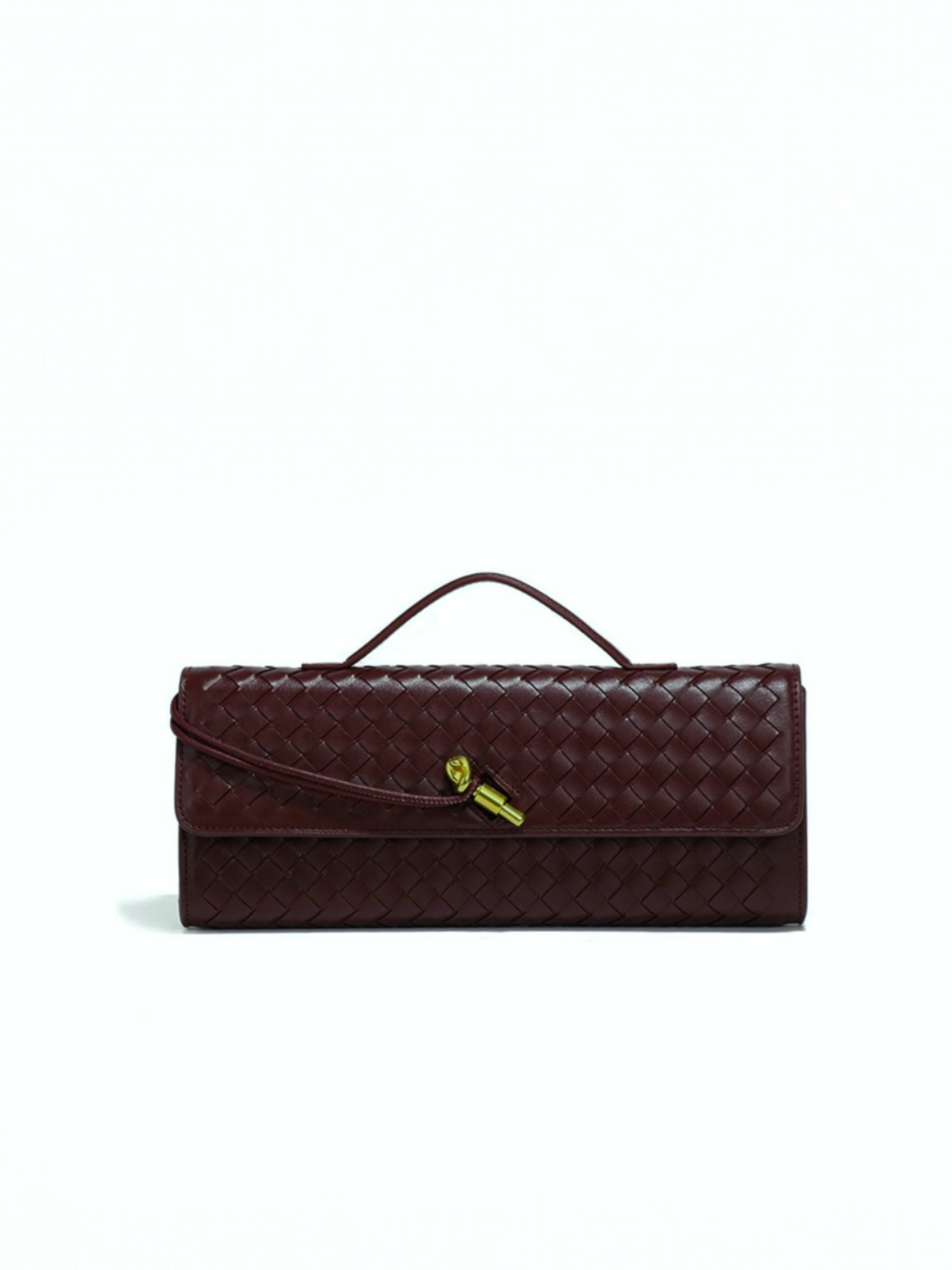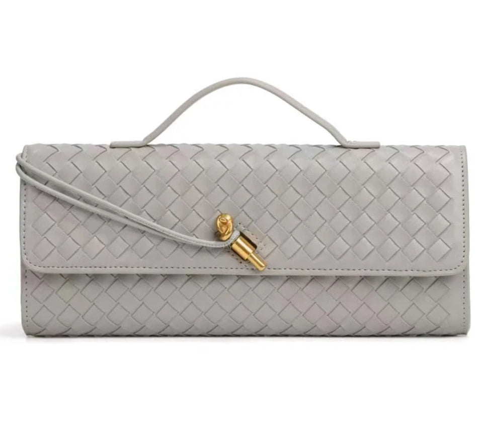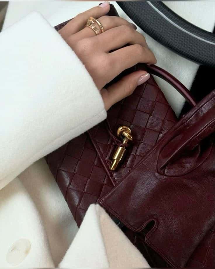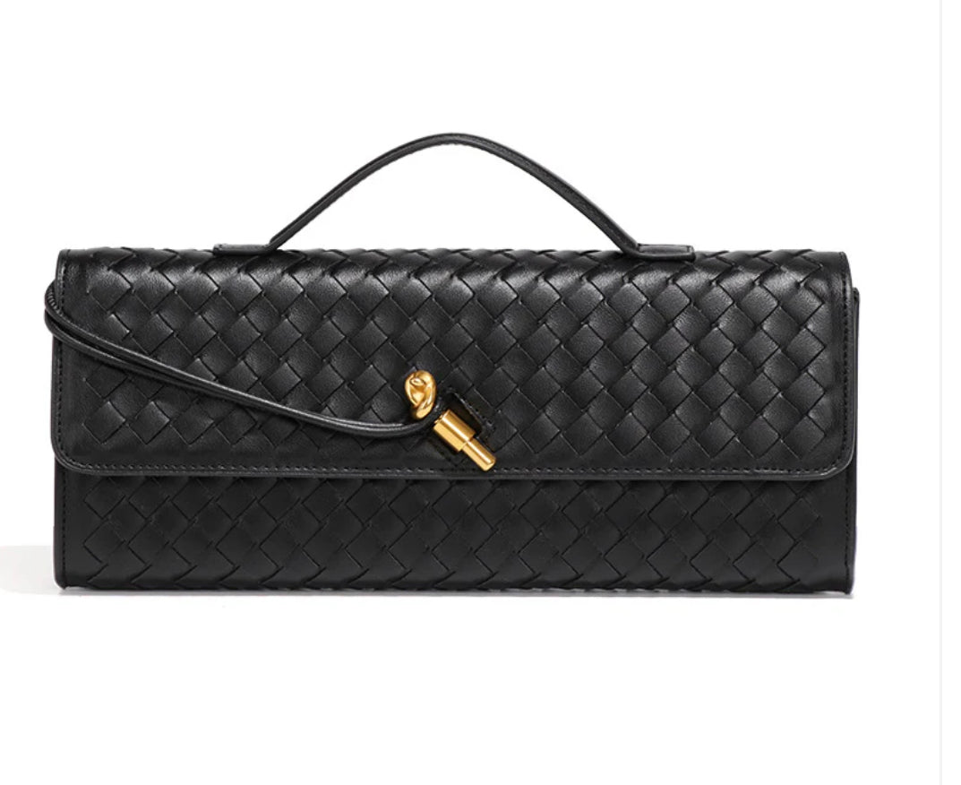 La lavorazione intrecciata a mano, dal design essenziale, incontra la chiusura a chiave dorata, segno distintivo di un lusso sobrio.
