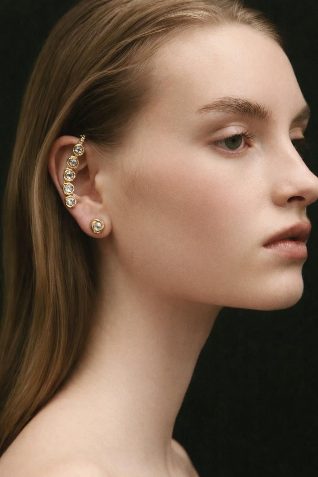 Un set raffinato e luminoso, pensato per impreziosire l’orecchio con eleganza contemporanea. Il punto luce dona brillantezza discreta, mentre l’ear cuff avvolge delicatamente il profilo con una scia di strass scintillanti. Perfetto per look minimal chic o per completare outfit da sera con un tocco prezioso.