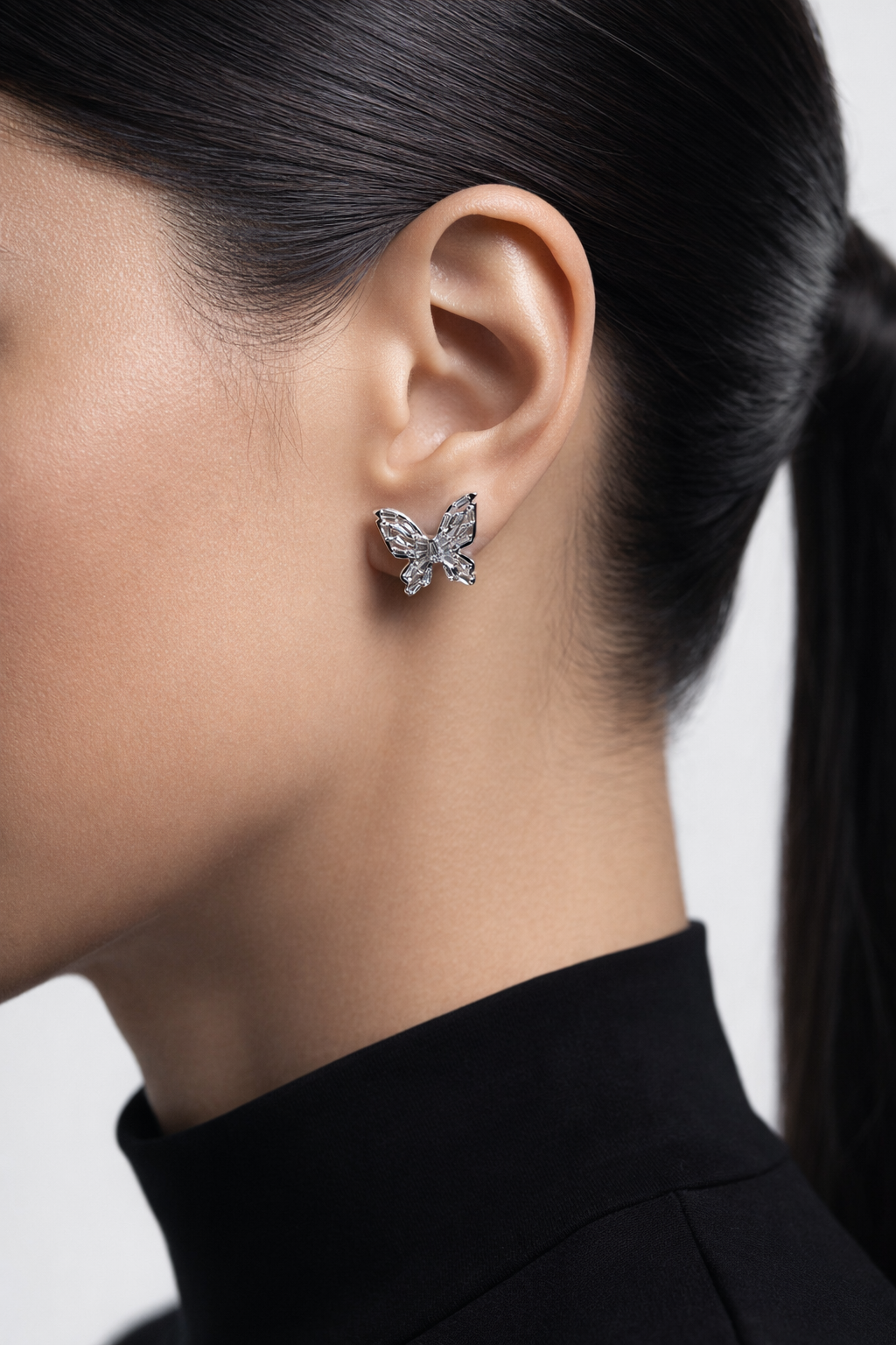 La forma a farfalla, luminosa e delicata, dona un tocco femminile e raffinato, perfetto per chi ama gioielli discreti ma d’impatto.