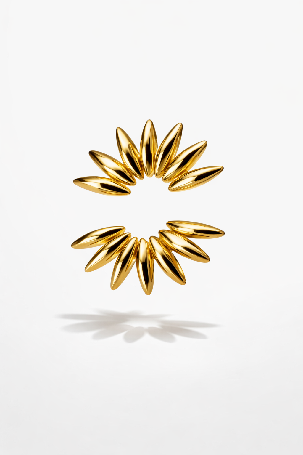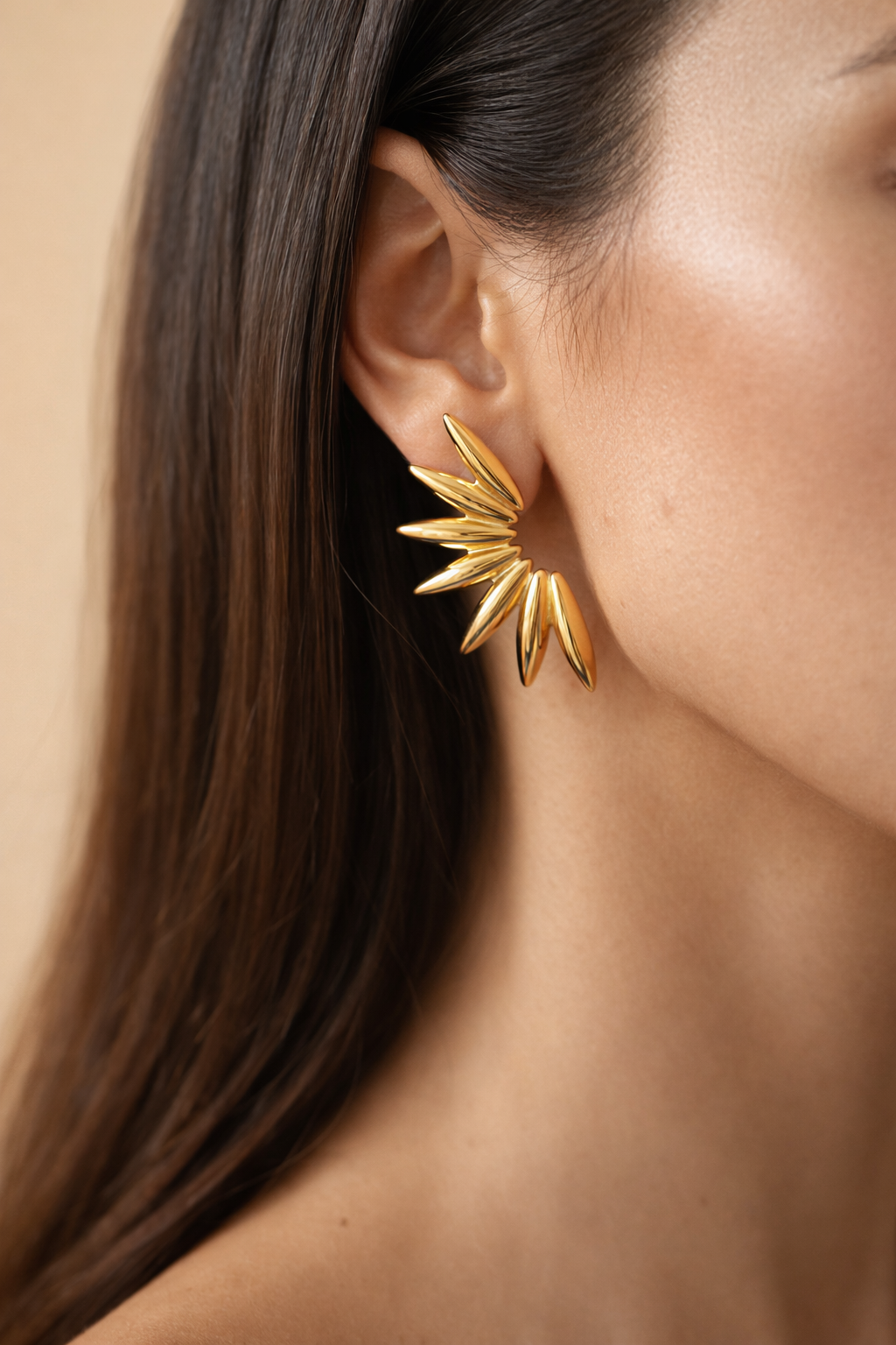 Linee decise e volumi luminosi si incontrano in un design scultoreo dal carattere contemporaneo. Questi orecchini in acciaio inossidabile sono caratterizzati da elementi affusolati con finitura dorata lucida, pensati per catturare la luce e valorizzare il viso con eleganza moderna.