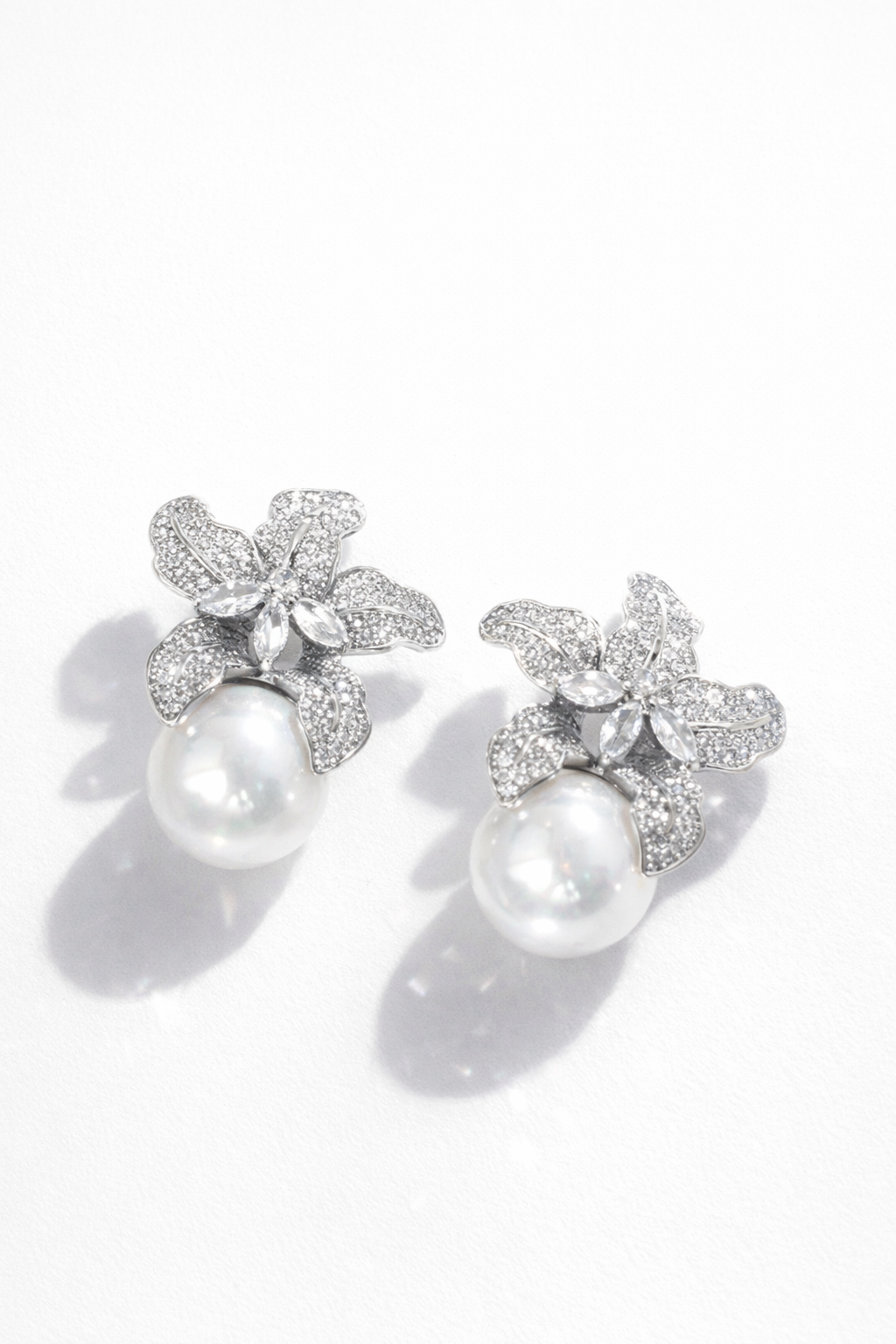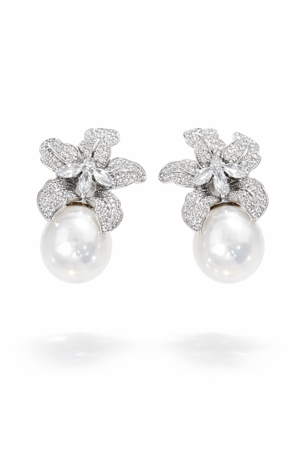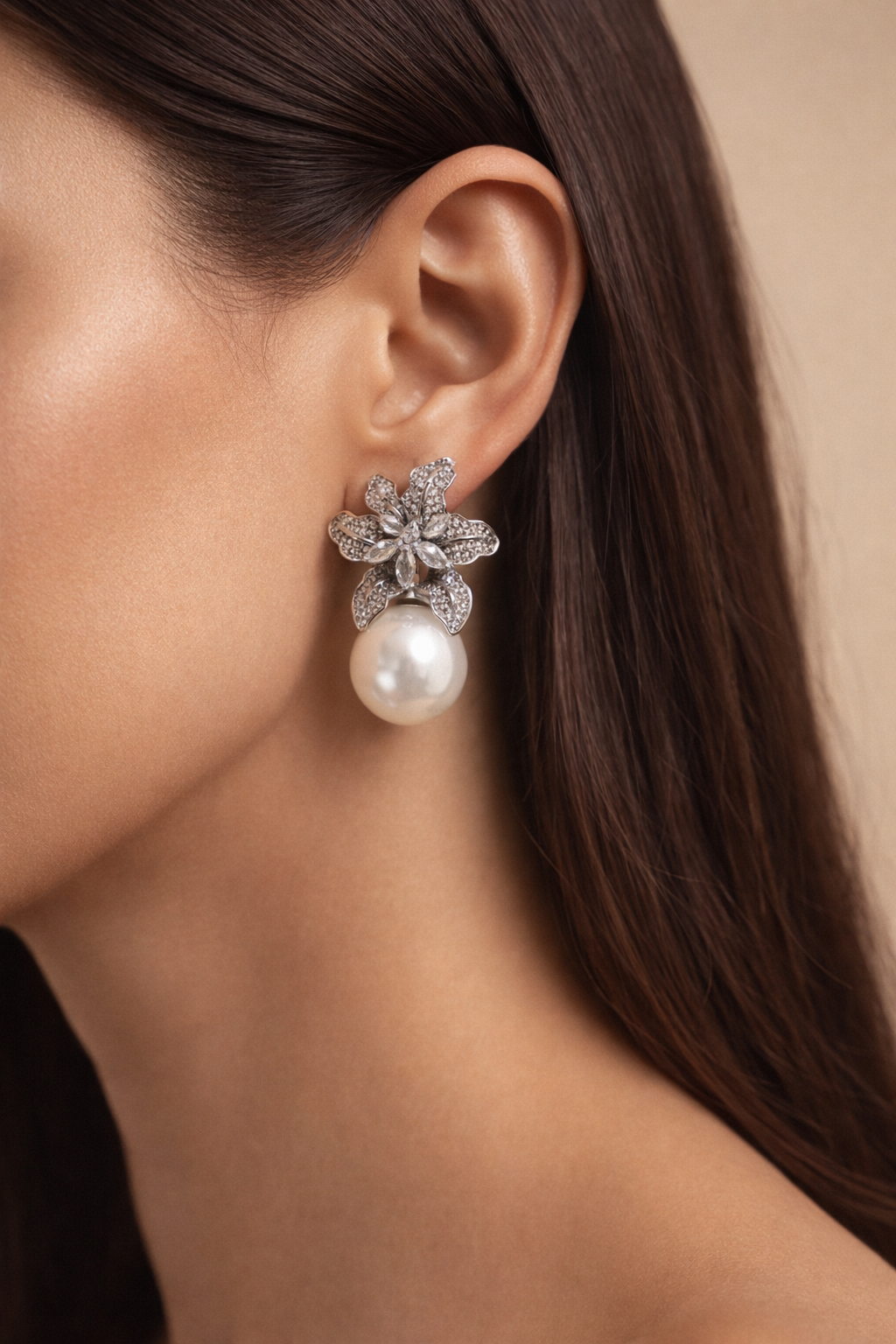 Orecchini raffinati in ottone finemente lavorato, impreziositi da una finta perla luminosa che dona luce e femminilità al viso. Il design floreale, arricchito da dettagli scintillanti, richiama l’eleganza dell’alta gioielleria, rendendoli perfetti per cerimonie, eventi speciali e look bridal contemporanei.